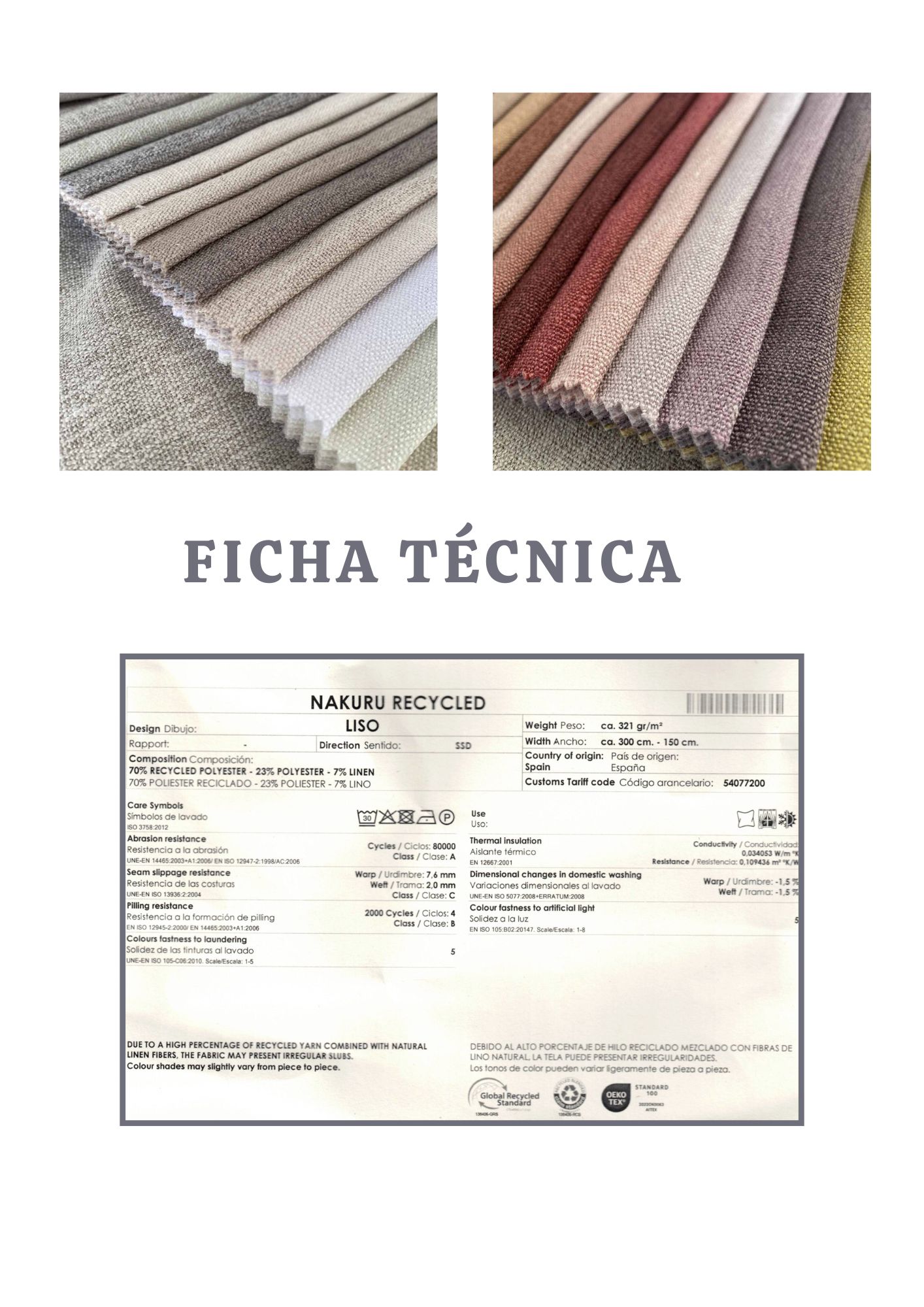 NAKURU70% RECYCLED POLYESTER 23% POLYESTER – 7% LINEN Pilling resistence: 2000 cicles Uso: Cortinas y Decoración VER PDF